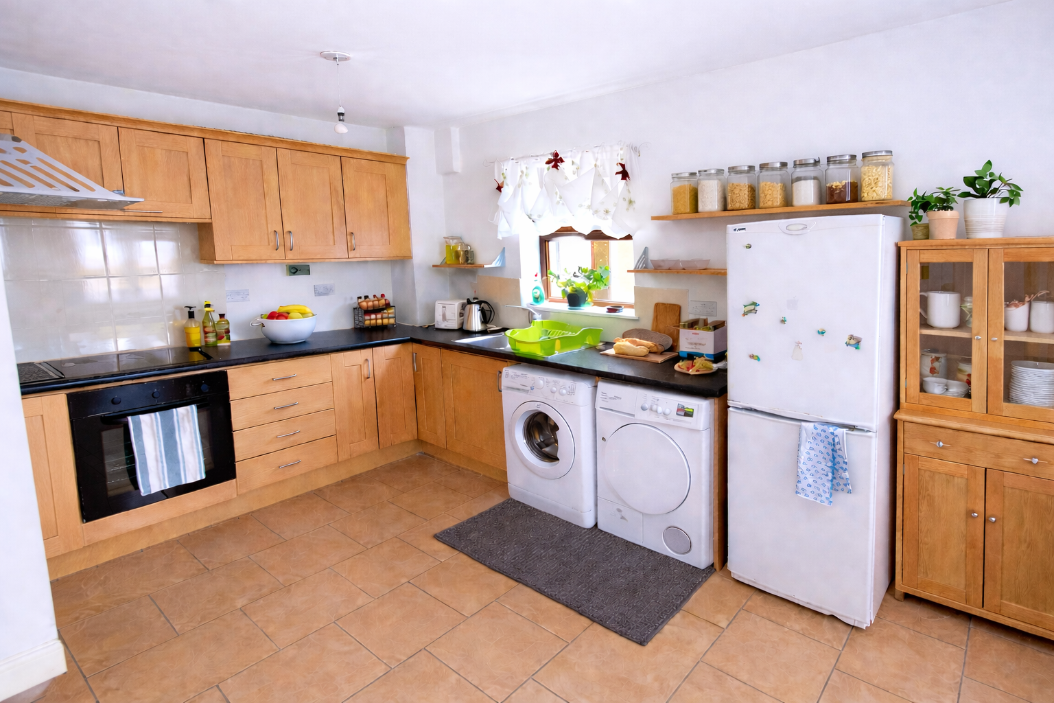 Fully fitted kitchen with built-in hob and extractor, tiled flooring, and ample dining space.